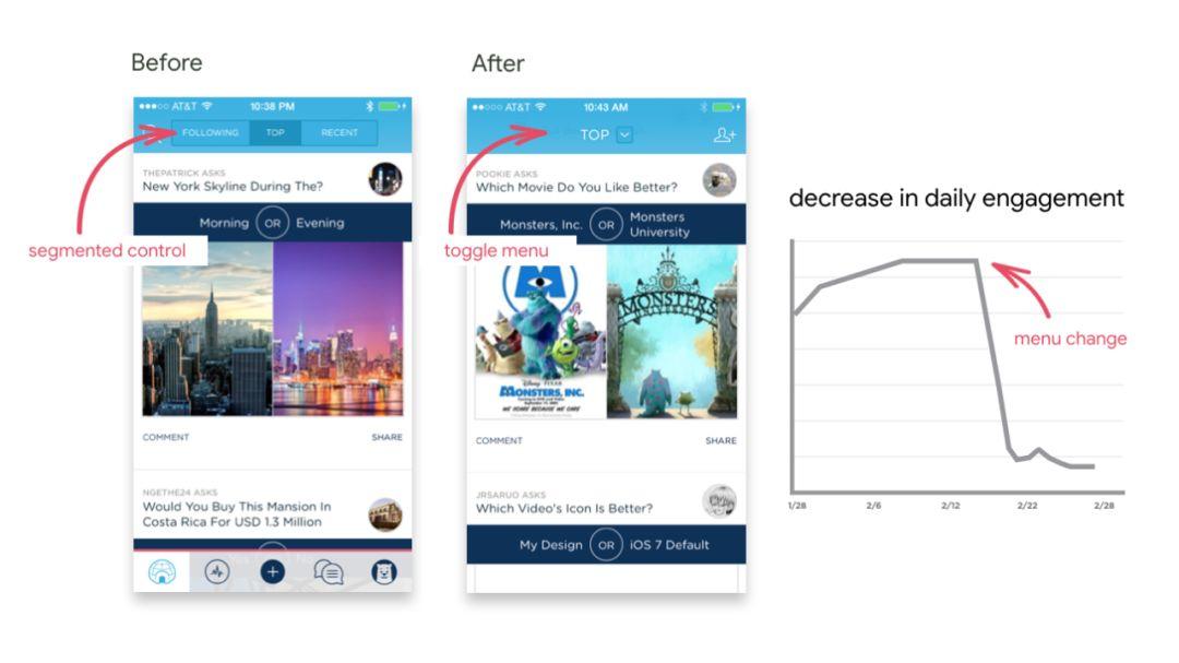 另一方面,Wroblewski发现,如果用户很难找到常用功能,活跃度也会降低。(以前的)Polar App把他们的导航设计从分段控制菜单简化为切换菜单,这似乎看起来“更干净”了;但用户的活跃度下降了,因为App的主要功能没有不再直接暴露给用户。