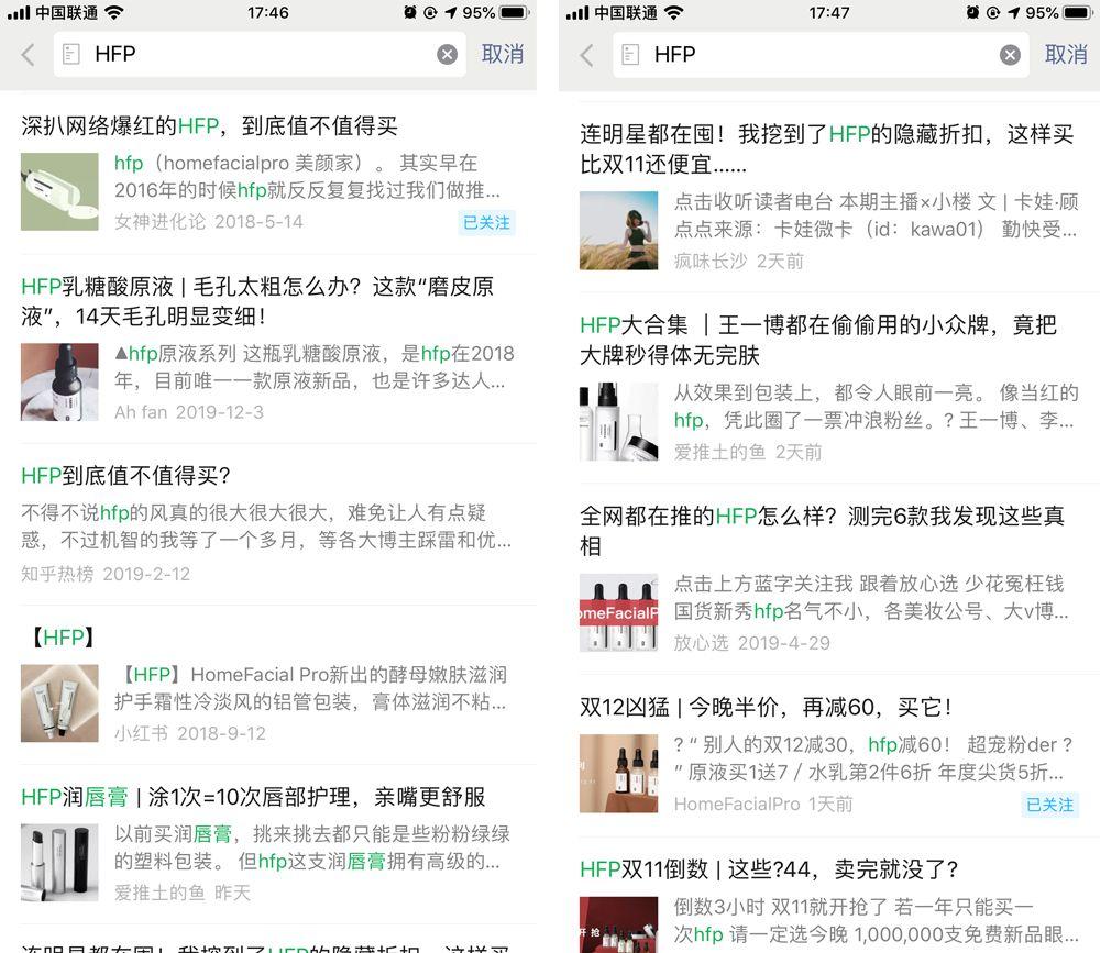 而护肤类产品,消费者更关心成分功效、使用效果,能承载更多文字和图片的公众号文章则是HFP更好的沟通形式。HFP选择的KOL类型覆盖心灵、资讯、时尚、种草多个领域,从不同维度和用户沟通刺激购买。同时,投放并不局限于单品或爆品,商品结构主要以“常规产品+季节产品+新增单品”的组合。