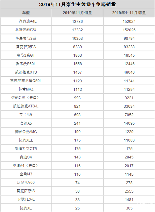 一是豪华中型车市场,2019年1-11月销量排行榜。